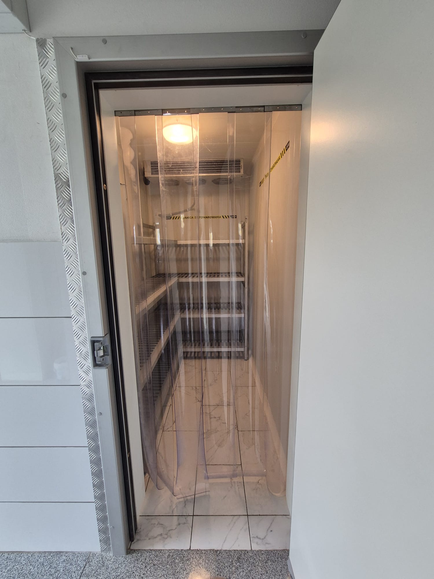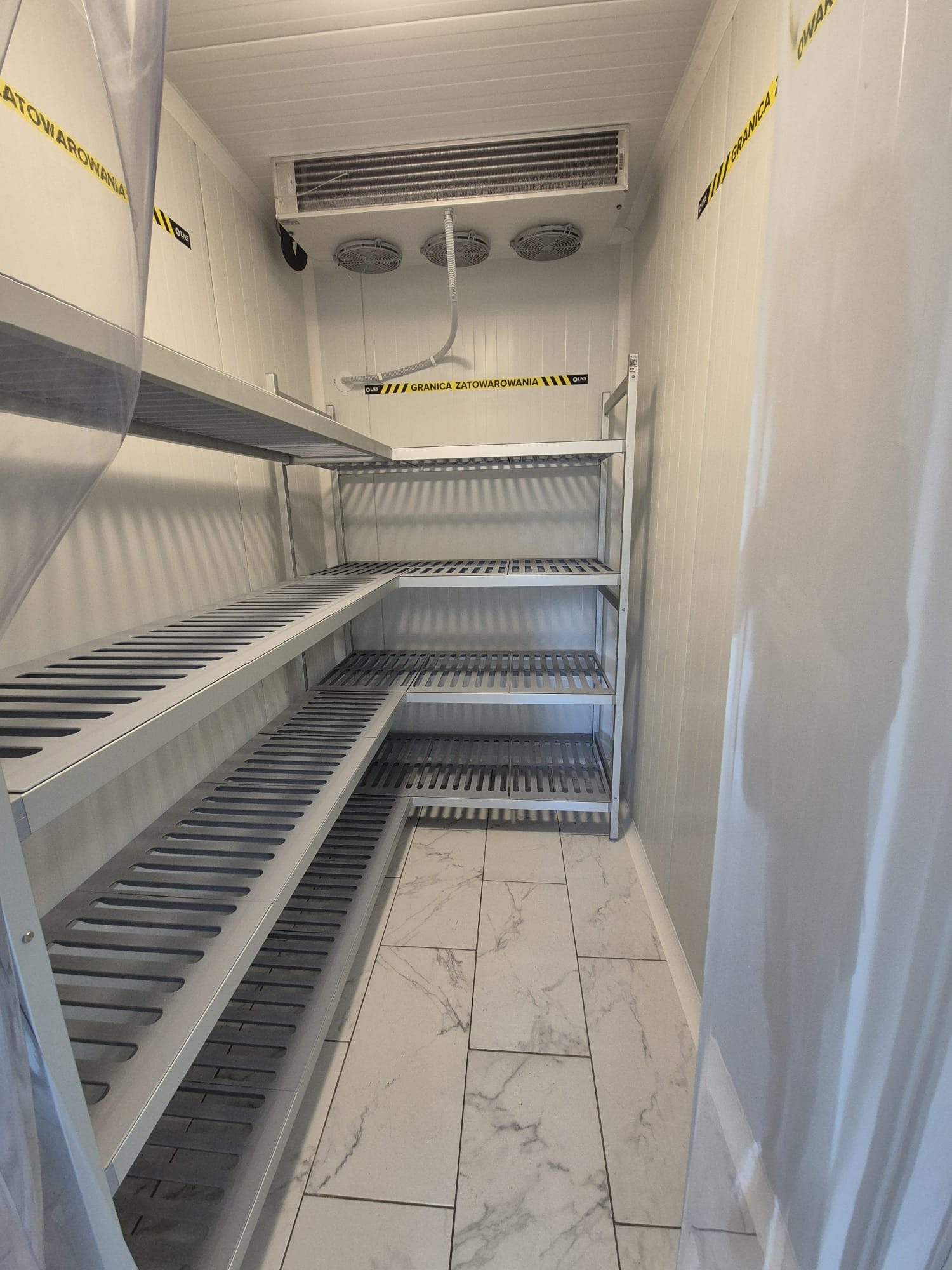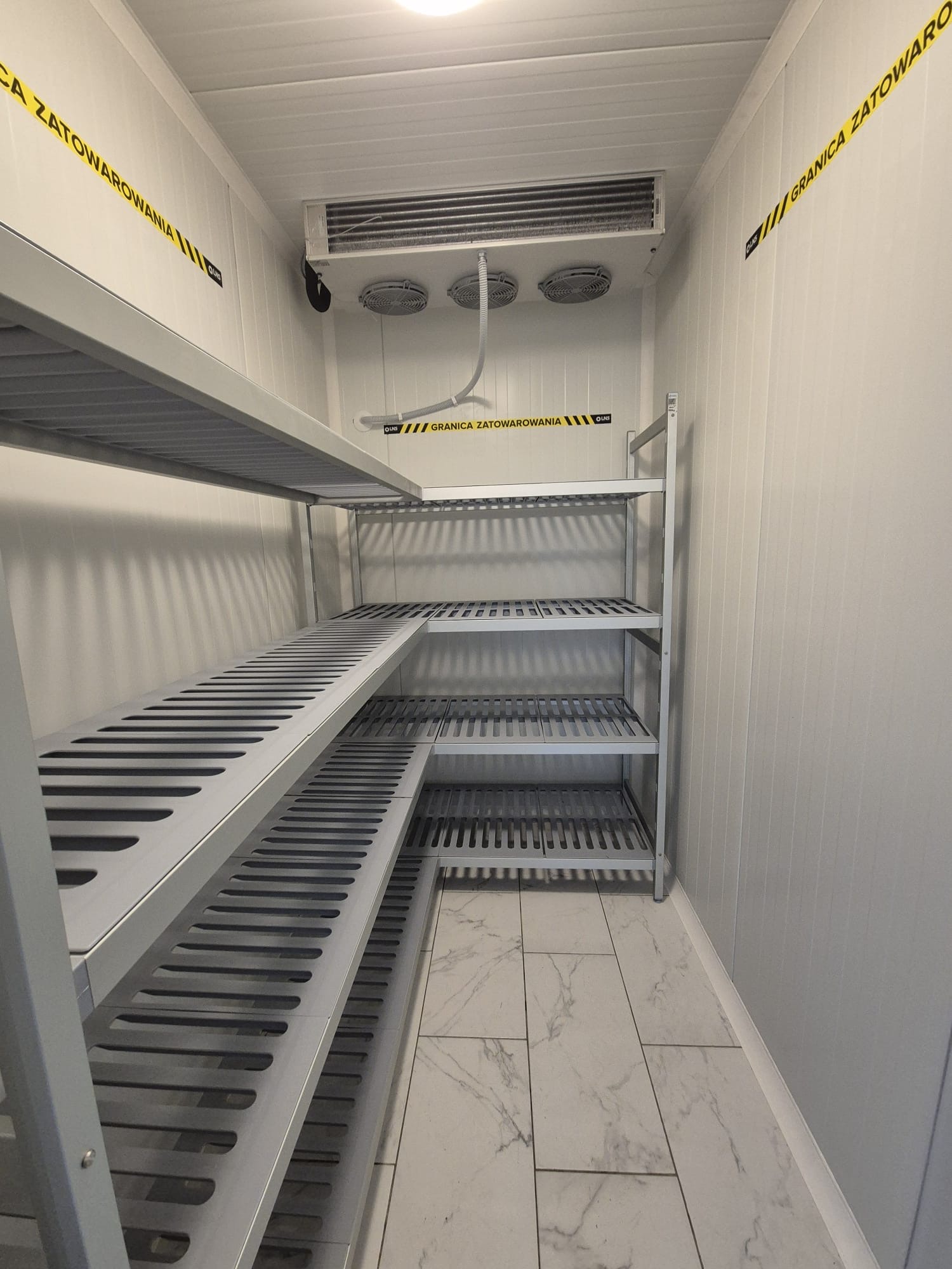Komora została wyposażona w wyciszony agregat Cool Craft, który zapewnia cichą i wydajną pracę. Dodatkowo zamontowaliśmy regały systemowe Optima, dzięki którym wnętrze jest ergonomiczne i uporządkowane.